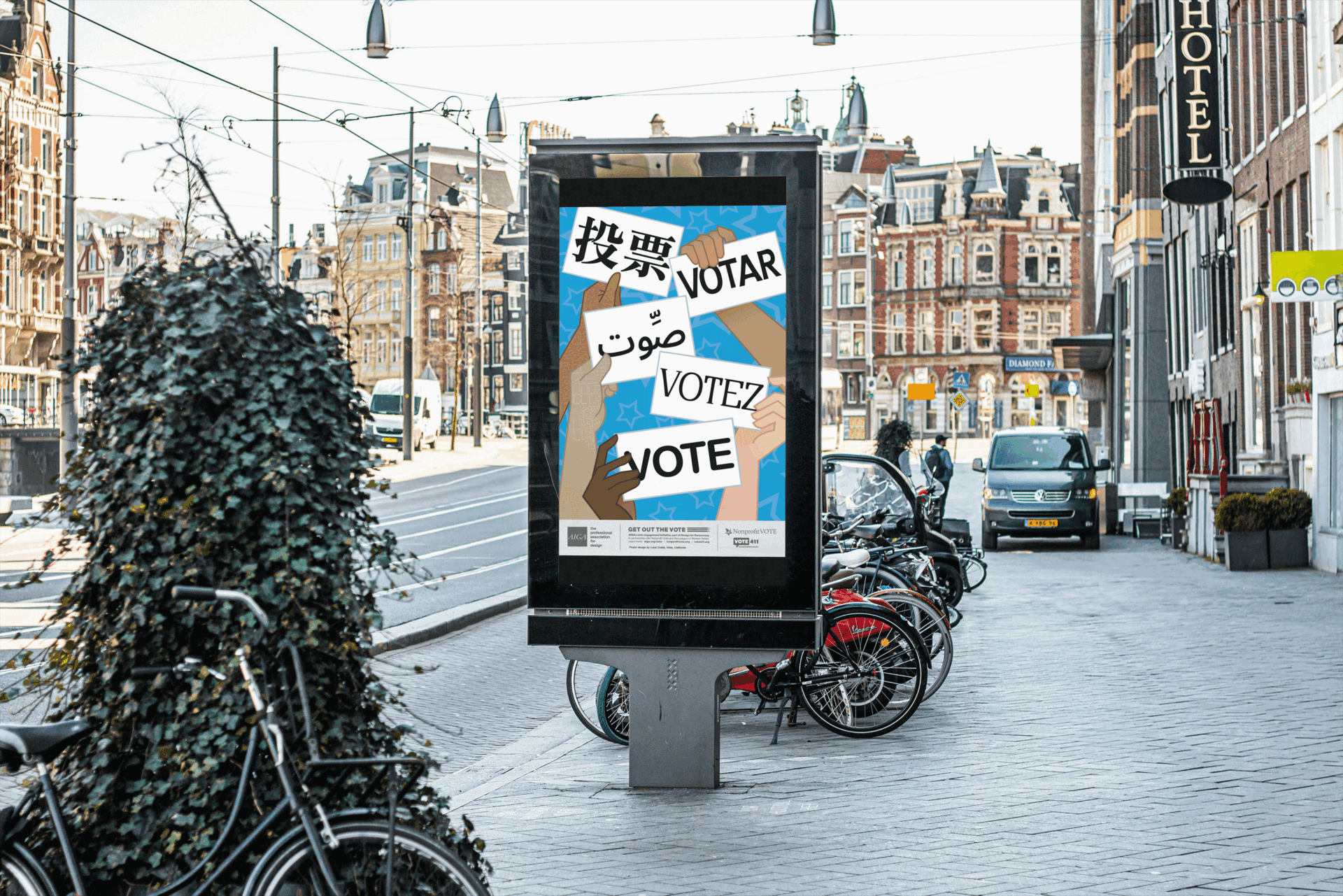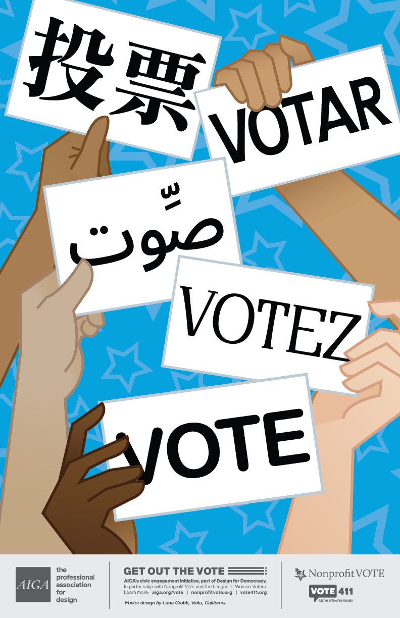 Voting transcends borders, languages, and cultures. It is a universal right and a powerful act of expression. This poster brings together diverse hands and the word 'vote' in Arabic, Chinese, French, Spanish, and English to symbolize the strength of our collective voice. No matter where we come from or what language we speak, our votes unite us in shaping our shared future. Together, we are stronger. Together, we are united. United in Vote.